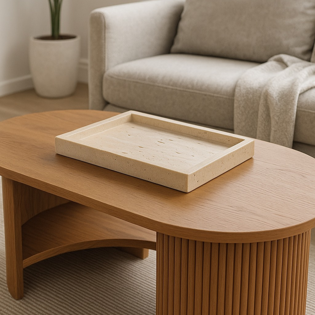 - Stoliki kawowe i półki – cienka płyta trawertynu na subtelnej metalowej konstrukcji wpisuje się w japandi, łącząc prostą formę z naturalnym surowcem. Takie dodatki wprowadzają do wnętrza rytm i ciepło, a jednocześnie pozostają wizualnie lekkie.