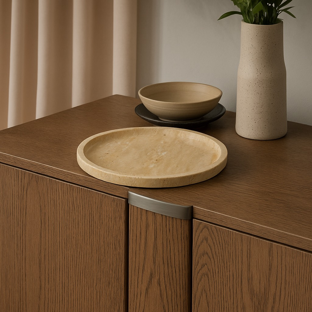 - Uchwyty meblowe z trawertynu – niewielki detal, który potrafi całkowicie odmienić wygląd kuchni, łazienki czy komody w salonie. Naturalne żyłkowanie i beżowa tonacja uchwytów doskonale komponują się z jasnym drewnem i prostymi frontami meblowymi.