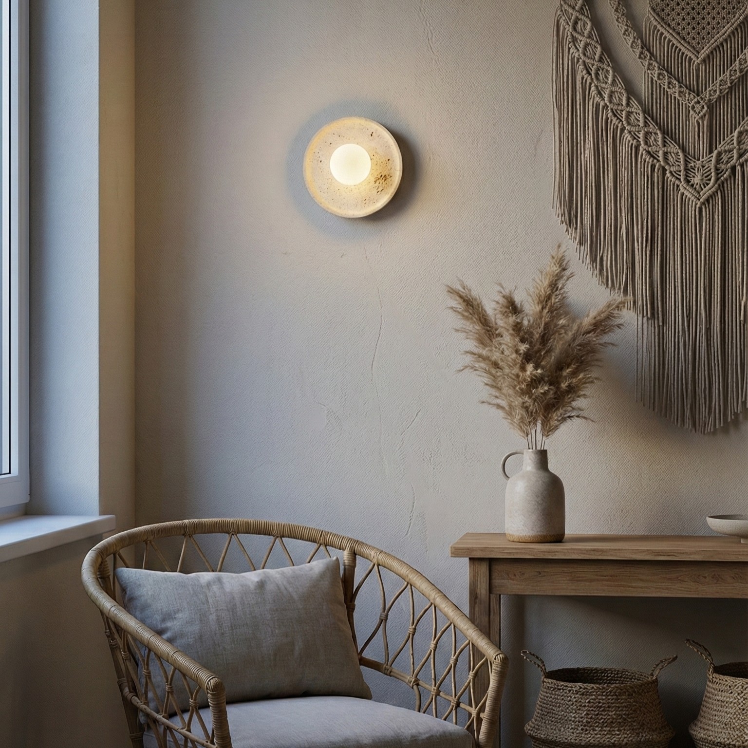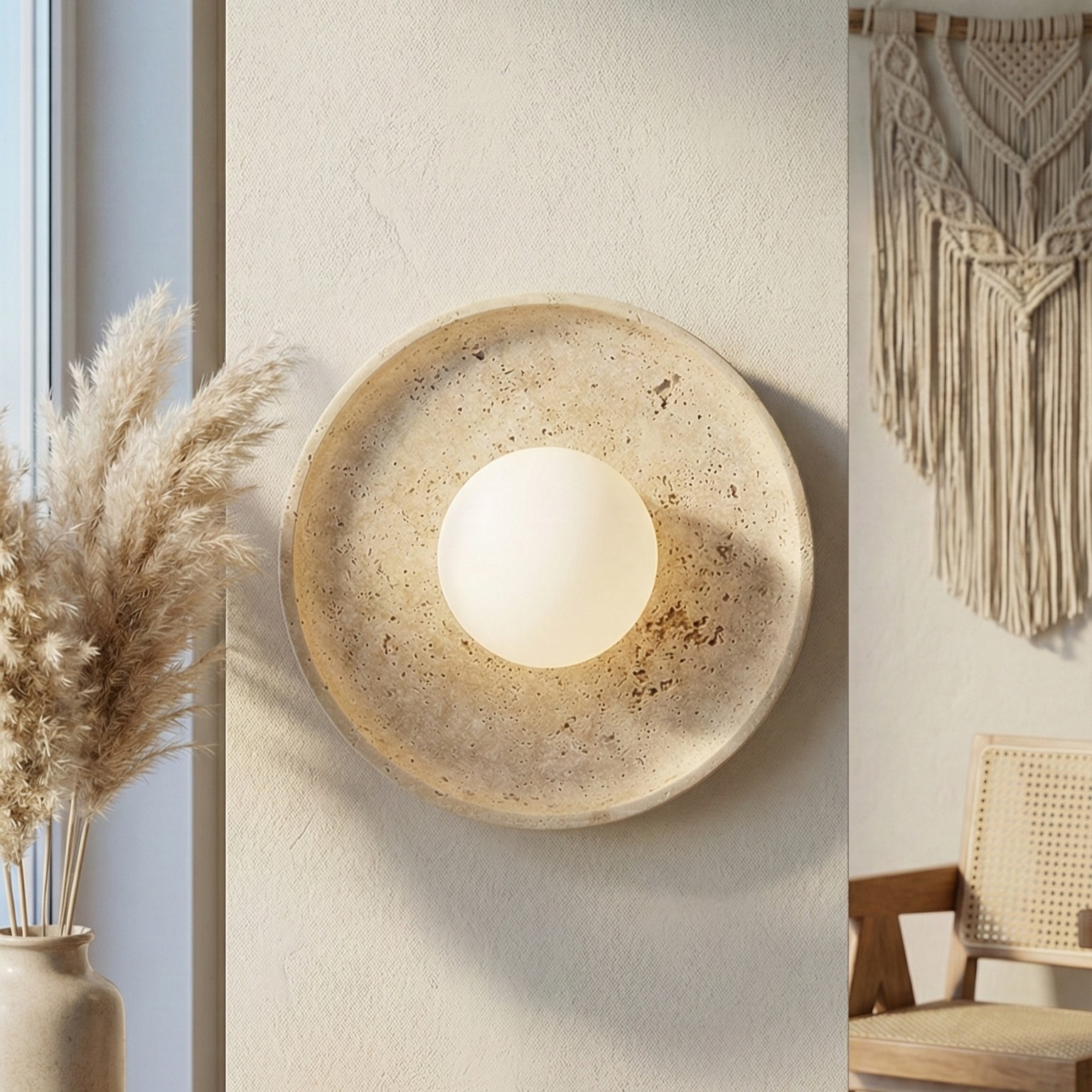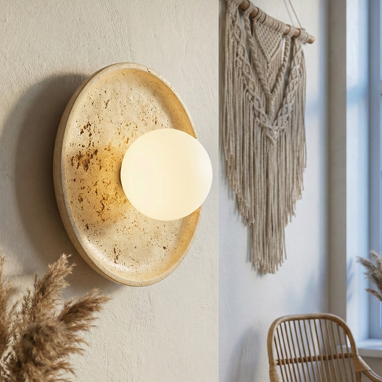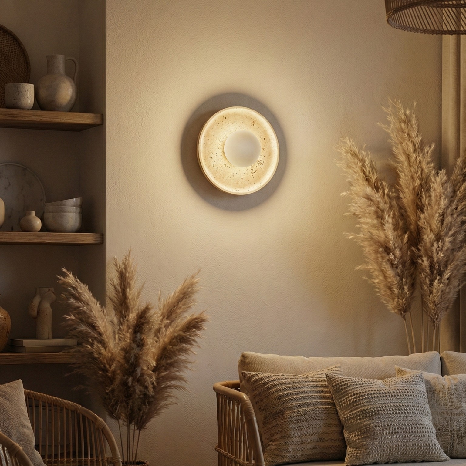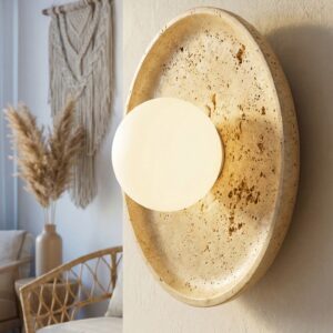 Kinkiet z trawertynu Orbella – elegancki kamień, ciepłe światło i unikalny design. Odkryj oświetlenie o średnicy 250 mm.