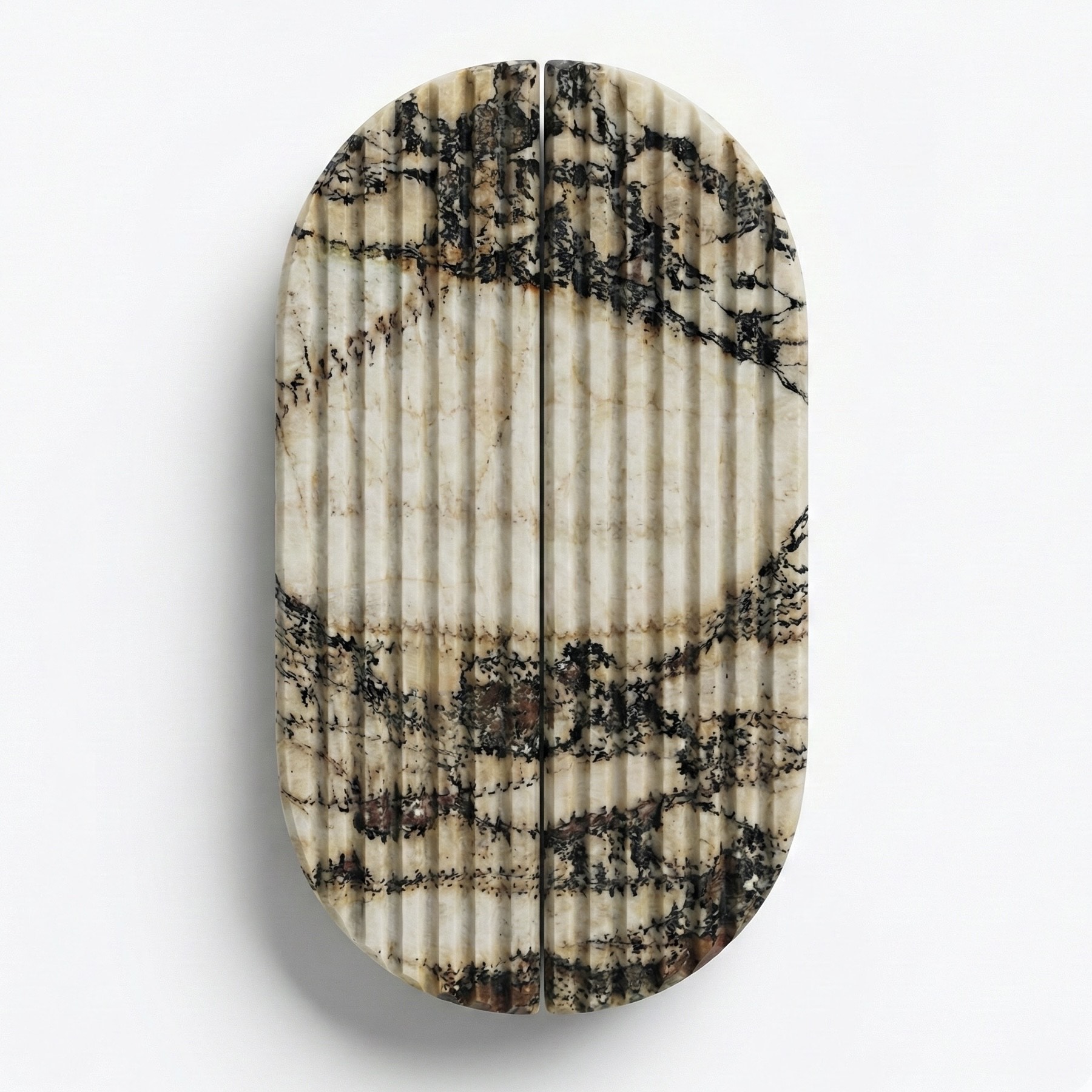 Powierzchnia jest lekko matowa i delikatnie szczotkowana, co wydobywa subtelną głębię kamienia. Linearne ryflowania tworzą elegancki rytm na powierzchni, a długie krawędzie podcięte pod kątem 45° zapewniają wygodny pochwyt oraz harmonijną formę.