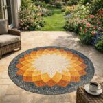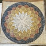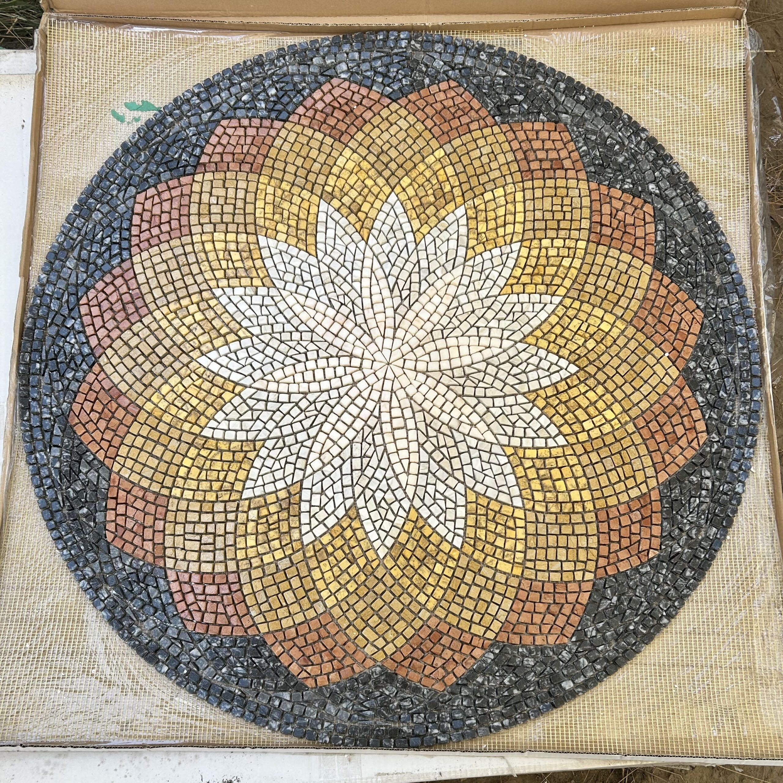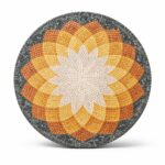 Mozaika marmurowa wzór 07 została wykonana z drobnych, ręcznie ciętych kostek, precyzyjnie osadzonych na elastycznej siatce montażowej. Kompozycja opiera się na symetrycznym, wielopłatkowym układzie, który tworzy efekt rozkwitającego kwiatu. Ciepłe przejścia między odcieniami żółci, ochry i pomarańczu nadają powierzchni głębię i trójwymiarowość.